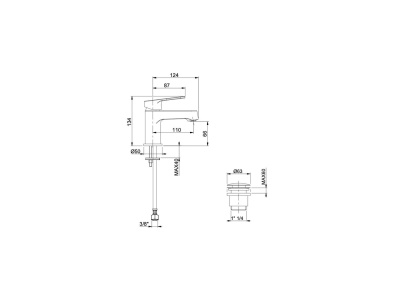 Miscelatore monocomando lavabo con bocca di erogazione fissa, aeratore M16,5×1 con portata massima 5 l/min e cartuccia da 28 mm. Sporgenza bocca di erogazione 110 mm, altezza 70 mm. Tubi flessibili con attacco G3/8”. Sistema di fissaggio Easy Fix.