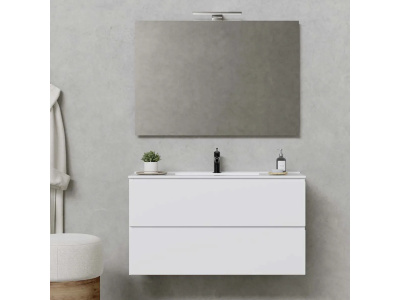 Un pratico mobiletto sospeso con larghezza 110cm di colore grigio cielo finitura cemento, dal design moderno e minimal, ideale per bagni di piccole dimensioni. La base è corredata di un ripiano sul lato destro che consente di distribuire in modo pratico e funzionale gli spazi dove riporre eventualmente asciugamani e gli altri oggetti di uso quotidiano in bagno. Il lavandino ceramico in appoggio 45x12h può essere abbinato a rubinetteria a parete oppure con un rubinetto a canna alta. Il mobile non è dotato di foro per miscelatore e questo permetterà di personalizzarne la posizione praticando il foro in base alle proprie esigenze. La trama della struttura è a rilievo creando così una piacevole sensazione al tatto. La specchiera contenitiva 60x110x18cm ha un’anta a ribalta a specchio con chiusura ammortizzata, mentre al suo interno sono presenti altri due ripiani in cristallo che forniscono ulteriori spazi per la sistemazione, mantenendo allo stesso tempo gli ingombri ridotti. Sulla specchiera è montata una lampada a led da 25cm.